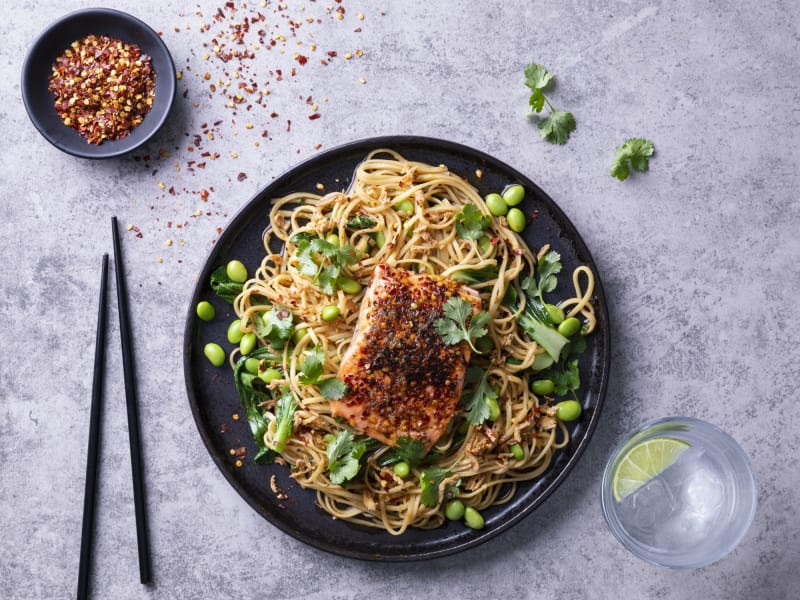 with egg noodles & edamame beans